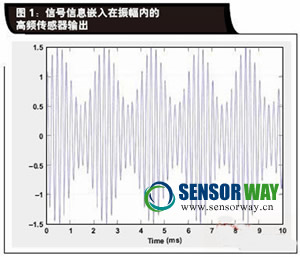 在傳感器輸出高頻率信號(hào)的情況下,信號(hào)信息通常大多嵌入在信號(hào)的振幅中。圖 1 是高頻率傳感器信號(hào)的時(shí)間曲線圖,而且振幅代表傳感器測(cè)量的物理量變化。該信號(hào)的數(shù)學(xué)表達(dá)式為: