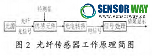 光纖傳感系統(tǒng)由光源、光導(dǎo)纖維、光傳感元件,光調(diào)制元件和信號(hào)處理五部分組成,其工作原理如圖2所示。光源發(fā)出的光經(jīng)過光導(dǎo)纖維進(jìn)入光 傳感元件,而在光傳感元件中受到周圍環(huán)境場的彩 響而發(fā)生變化的光再進(jìn)入光調(diào)制機(jī)構(gòu),由其將傳感 元件測量的參數(shù)調(diào)制成幅度、相位、偏振等信息, 最后利用微處理器進(jìn)行信號(hào)分析。