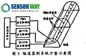 光纖傳感器在隧道上應(yīng)用比較成熟,例如武漢 的天興洲大橋上有成百上千個(gè)光纖傳感測點(diǎn),時(shí)時(shí) 監(jiān)控橋梁的結(jié)構(gòu)、受力和振動(dòng)等情況,一旦發(fā)現(xiàn)異 常,管理機(jī)構(gòu)就能立即采取措施。以某湖底隧道為 例,施工地質(zhì)條件不理想,難度大,尤其是湖區(qū)沙 層分布廣泛,厚度大,對(duì)隧道結(jié)構(gòu)采用了分布式 BOTDR光纖檢測系統(tǒng),沿隧道軸向敷設(shè)4根光纖, 其中兩根全面接著(監(jiān)測隧道整體變形),兩根定 點(diǎn)接著(監(jiān)測變形縫和潛在變形處的變形情況)。 通過采用光纖傳感器對(duì)隧道進(jìn)行監(jiān)測,實(shí)時(shí)監(jiān)測隧 道變形情況,能夠獲得可靠的數(shù)據(jù),可分析出正確 結(jié)果,反映隧道實(shí)際受力情況,起到隧道的健康監(jiān) 測、預(yù)防保護(hù)作用;能夠體現(xiàn)出光纖光柵傳感器的強(qiáng)大優(yōu)勢,保證了施工的順利進(jìn)行,提升了施工質(zhì)量。光纖傳感器在橋梁隧道監(jiān)測方面的應(yīng)用主要有 以下三個(gè)方面:對(duì)采用新型復(fù)合材料的橋梁結(jié)構(gòu)進(jìn) 行監(jiān)測,掌握材料和結(jié)構(gòu)的工作性能;對(duì)交通樞紐或具有重大意義的大型橋梁進(jìn)行健康監(jiān)測,掌握橋 梁的正常運(yùn)行狀態(tài);對(duì)有一定損傷的舊橋進(jìn)行監(jiān) 測,從而了解其健康狀況并采取針對(duì)性的維護(hù)和加固措施。如圖3所示: