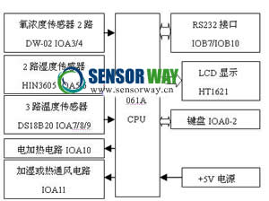 系統(tǒng)硬件電路原理框圖如圖1所示,主要由SPCE061A單片機、溫濕度傳感器、氧濃度度傳感器、LCD顯示電路、鍵盤電路、RS232通信電路、時鐘電路等組成。SPCE061A是一款基于µ'nSP內(nèi)核的16位單片機。