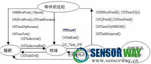 為了充分發(fā)揮操作系統(tǒng)在任務(wù)調(diào)度、任務(wù)管理、任務(wù)通信、時間管理和內(nèi)存管理等方面的優(yōu)勢,首先必須根據(jù)需要實現(xiàn)的功能,合理的劃分任務(wù)和分配任務(wù)的優(yōu)先級。按溫濕度測控系統(tǒng)所要求實現(xiàn)的功能,將整個系統(tǒng)劃分為并行存在的任務(wù)層和中斷程序。μC/OS-II嵌入式實時操作系統(tǒng)中的任務(wù)狀態(tài)轉(zhuǎn)換如圖2所示。
