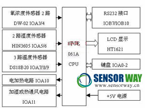 系統(tǒng)硬件電路原理框圖如圖1所示,主要由SPCE061A單片機(jī)、溫濕度傳感器、氧濃度度傳感器、LCD顯示電路、鍵盤電路、RS232通信電路、時鐘電路等組成。SPCE061A是一款基nSP內(nèi)核的16位單片機(jī)。