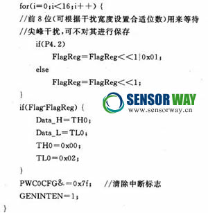 源程序中定義了3個變量,其中變量Flag存儲原狀態(tài)值;FlagReg存儲當(dāng)前采樣值;變量i記錄采樣次數(shù);改變i的值可控制濾除尖峰脈沖的等待時間。程序通過對原狀態(tài)與當(dāng)前采樣狀態(tài)異或之后的值來判斷當(dāng)前信號是有效信號還是干擾信號,從而對上升沿、下降沿的中間過度或尖峰脈沖干擾進(jìn)行相應(yīng)處理,退出中斷子程序。實(shí)現(xiàn)了對正常信號計數(shù)、濾掉尖峰脈沖干擾的目的。