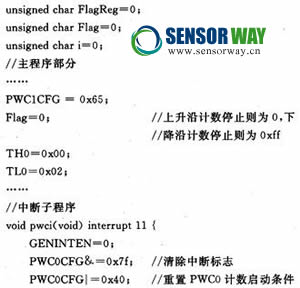 對應(yīng)程序流程圖,給出了單片機(jī)通過P4.2口對ADXL202某一輸出通道采樣濾波并完成脈寬計數(shù)的源程序。源程序如下: