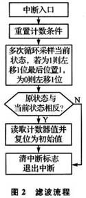 根據(jù)軟件濾波設(shè)計思想,濾波子程序由主程序在信號狀態(tài)發(fā)生變化,進(jìn)入中斷時調(diào)用,圖2給出了濾波程序流程。對照圖1中4種Section來分析流程圖。當(dāng)有邊沿或干擾信號(信號周期大于計數(shù)時鐘周期)到來時,VRS51L3074單片機(jī)的PWC計數(shù)停止條件滿足,系統(tǒng)進(jìn)入中斷服務(wù)子程序。在中斷子程序中,首先重置脈寬計數(shù)條件,然后對當(dāng)前狀態(tài)進(jìn)行采樣,采樣1次,狀態(tài)寄存器左移1位,采樣到高電平記為“1”,采樣到低電平記為“0”。如正常下降沿Section B,前面處于高電平段,初始狀態(tài)變量Flag全為1,當(dāng)出現(xiàn)低電平,控制器進(jìn)人中斷,緊接著進(jìn)行16次采樣。前已提及系統(tǒng)處理的尖峰干擾約1~2 ms,每個采樣周期約為0.4 ms,其尖峰干擾脈寬達(dá)不到8個采樣周期。系統(tǒng)設(shè)計時采樣16次,只取最后8次的存儲狀態(tài)與原狀態(tài)進(jìn)行比較,如果最后采樣的狀態(tài)全為“0”則與原狀態(tài)相反,就可判斷出這是1個正常下降沿。如果是干擾信號引起計數(shù)中斷,前面8個采樣狀態(tài)不全為“1”,后面8個狀態(tài)全為“1”,最后采樣的狀態(tài)與原狀態(tài)相同,就可判斷出這是1個干擾信號,如Section A。在信號狀態(tài)采樣期間,計數(shù)條件滿足PWC繼續(xù)計數(shù),直到真正的下降沿到來,計數(shù)停止并保存,計數(shù)寄存器還原為初始值,這樣干擾信號即被濾除。類似地,正常上升沿Section D,存儲器原狀態(tài)為“0”,上升沿來臨后存儲器狀態(tài)為“1”,與原狀態(tài)相反,PWC計數(shù)停止并保存,計數(shù)寄存器還原為初始值,退出中斷子程序。有干擾信號出現(xiàn)后采樣狀態(tài)與原狀態(tài)相同,干擾尖峰脈沖可被濾除。如果要使脈寬計數(shù)更精確,可判斷前8個采樣周期中系統(tǒng)不正常計數(shù)的周期,然后與最終計數(shù)周期相加即可。此時,程序流程體現(xiàn)出軟件濾波功能。