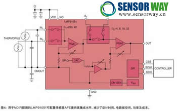 同樣,NDIR系統(tǒng)需要一個(gè)基準(zhǔn)通道、可調(diào)放大倍率、偏移補(bǔ)償,以及偏置。LMP91051可配置傳感器AFE為NDIR探測(cè)應(yīng)用完成這些工作(圖4)。它有一個(gè)雙通道輸入,支持活動(dòng)通道和基準(zhǔn)通道、PGA、可調(diào)偏移抑制DAC,以及共模發(fā)生器。LMP91051能夠?qū)⑦@些重要的NDIR系統(tǒng)塊集成到一起,從而減少了設(shè)計(jì)時(shí)間、電路板空間、功率,以及成本。