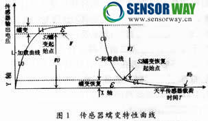 保持溫度恒定,在某一恒定機(jī)械應(yīng)變長(zhǎng)期作用下,傳感器輸出隨時(shí)間變化的特性,稱為傳感器蠕變。在不承受載荷的條件下,傳感器隨時(shí)間變化的特性稱為零漂。零漂是不承受載荷條件下的蠕變。稱重傳感器的蠕變特性曲線如圖1所示(以正蠕變?yōu)槔,?fù)蠕變與正蠕變相類似),其中曲線L為傳感器的加載特性曲線,曲線C為傳感器的卸載特性曲線。從中可以看出,傳感器的加載曲線由加載段L0和蠕變段L1組成。在加載段L0,傳感器的輸出急劇增加,迅速達(dá)到載荷的真實(shí)變化值W0,