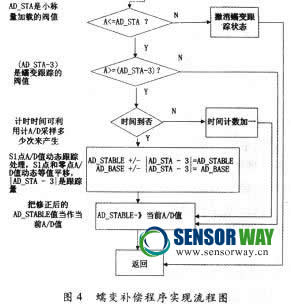 式(1)是加載到S1點(diǎn)天平的稱重值;式(2)是加載穩(wěn)定到S1點(diǎn)和進(jìn)行蠕變補(bǔ)償后天平的稱重值,式中載荷蠕變和受加載影響天平零點(diǎn)蠕變值同是ε。?蠕變跟蹤補(bǔ)償?shù)年P(guān)鍵是判斷和確定圖1所示的S1點(diǎn)、蠕變量ε與時(shí)間的關(guān)系,然后根據(jù)這一關(guān)系進(jìn)行蠕變補(bǔ)償。補(bǔ)償思路見圖4.圖4的前半段是確定S1點(diǎn),后半段是蠕變跟蹤處理。這里的關(guān)鍵問題是如何確定蠕變跟蹤量和跟蹤時(shí)間的關(guān)系。圖1只定性地說明傳感器的蠕變特性,但是,每個(gè)傳感器都有定量的特性,也就是蠕變量ε與時(shí)間的關(guān)系。只有確定這一關(guān)系,才能確定蠕變跟蹤時(shí)間和跟蹤量(圖4中的AD_STA3)。解決的辦法是在天平標(biāo)定時(shí)一起確定蠕變曲線。具體做法是:加載砝碼標(biāo)定時(shí)按規(guī)程測(cè)試蠕變特性,單片機(jī)先記錄下S1點(diǎn),并記錄每隔固定的時(shí)間段的當(dāng)前A/D值與S1點(diǎn)的差值,這就是該段時(shí)間的蠕變值。用軟件辦法記錄下這個(gè)傳感器蠕變量與時(shí)間的關(guān)系,然后再根據(jù)這一關(guān)系確定跟蹤量(AD_STA-3)和跟蹤時(shí)間。確定的原則是:固定的時(shí)間段蠕變量越大,跟蹤量(AD_STA-3)就越大和跟蹤間隔時(shí)間就越小。反之,跟蹤量(AD_STA-3)就越小和跟蹤間隔時(shí)間就越大。