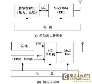 該TPMS系統(tǒng)包括兩種硬件模塊:輪胎壓力傳感器和胎壓控制器。筆者以基于ASK調(diào)制模式的MAX1473和MAX7044作為無線收發(fā)芯片,設(shè)計了輪胎壓力傳感器和胎壓控制器的硬件結(jié)構(gòu),如圖2所示。收發(fā)無線信號調(diào)制頻率為433.92MHz。