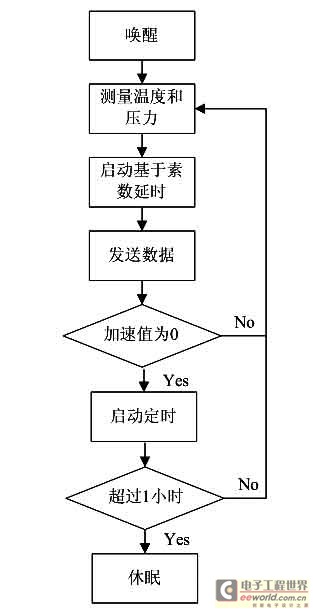 如何節(jié)能是輪胎壓力傳感器模塊軟件設(shè)計的關(guān)鍵問題。一個傳感器模塊要在一節(jié)幾百毫安時的電池下工作2~5年,而射頻發(fā)送數(shù)據(jù)幀時耗電最大,因此在保證數(shù)據(jù)傳輸正確的前提下應(yīng)盡量減少發(fā)送次數(shù)。發(fā)射模塊軟件流程如圖5所示,本設(shè)計采用了基于素數(shù)的動態(tài)時延算法,即各輪胎上的傳感器模塊在完成溫度、壓力的測量以后,分別按1000ms×N1(N1為小于20的隨機素數(shù))延時后再將數(shù)據(jù)發(fā)送出去。與采用固定周期的延時算法相比,這種動態(tài)時延算法能大大降低數(shù)據(jù)發(fā)送沖突的概率。此外,如果傳感器檢測到輪胎靜止超過1小時,則會自動進(jìn)入休眠模式,即不再發(fā)送數(shù)據(jù),直到被加速度信號喚醒。胎壓控制器即接收模塊的軟件流程如圖6所示。