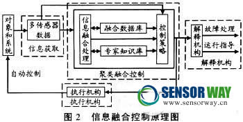 在工業(yè)控制中,過(guò)程運(yùn)行狀況簡(jiǎn)稱工況。在簡(jiǎn)單的系統(tǒng)中,某傳感器的輸出可大體反映工況。而在復(fù)雜的工業(yè)生產(chǎn)過(guò)程中,工況無(wú)法用一個(gè)或幾個(gè)過(guò)程變量直接表示,某傳感器的輸出只是描述了工況的一個(gè)側(cè)面。采用適當(dāng)?shù)男畔⑷诤戏椒,將從不同?cè)面描述工況的多個(gè)傳感器信息融合,就有可能獲得對(duì)工況的完整描述,能據(jù)此進(jìn)行操作和實(shí)時(shí)干預(yù),或系統(tǒng)按工況進(jìn)行自動(dòng)控制。圖2表明了信息融合控制的原理,這個(gè)過(guò)程可分解為以下部分: