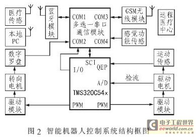 控制系統(tǒng)以DSP(TMS320C54x)為核心部件,由藍(lán)牙無(wú)線通信、GSM無(wú)線通信(支持GPRS)、電機(jī)驅(qū)動(dòng)、數(shù)字羅盤(pán)、感覺(jué)功能傳感器(視覺(jué)和聽(tīng)覺(jué)等)、醫(yī)療傳感器和多選一串口通信(RS-232)模塊等組成,控制系統(tǒng)框圖如圖2所示。