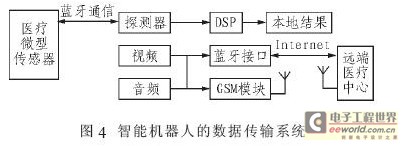 在智能機(jī)器人上安裝1個(gè)帶有藍(lán)牙模塊的探測(cè)器作為接收設(shè)備,各種醫(yī)療傳感器將采集到的生理信息數(shù)據(jù)通過(guò)藍(lán)牙模塊傳輸?shù)教綔y(cè)器,探測(cè)器有2種工作方式:一是將數(shù)據(jù)交給智能機(jī)器人處理,提供本地結(jié)果;二是與Internet連接(也可以通過(guò)GSM無(wú)線模塊直接發(fā)回),通過(guò)網(wǎng)絡(luò)將數(shù)據(jù)傳輸?shù)竭h(yuǎn)程醫(yī)療中心,達(dá)到醫(yī)療保健與遠(yuǎn)程監(jiān)護(hù)的目的。視頻和音頻數(shù)據(jù)的傳輸也采用這種方式。智能機(jī)器人的數(shù)據(jù)傳輸系統(tǒng)如圖4所示。