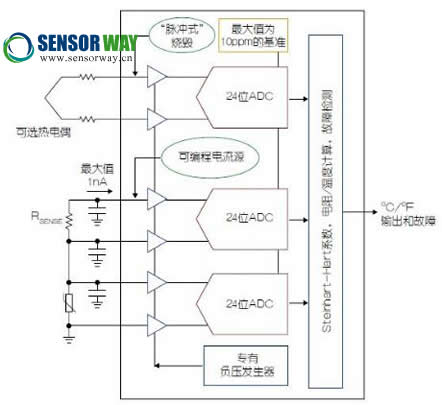 以前,RTD和檢測(cè)電阻器之間的比例式測(cè)量是用單個(gè)ADC執(zhí)行的。檢測(cè)電阻器的壓降用作測(cè)量RTD壓降的ADC之基準(zhǔn)輸入。這種架構(gòu)需要10 kΩ或更大的檢測(cè)電阻器,因此需要緩沖,以防止由ADC基準(zhǔn)輸入動(dòng)態(tài)電流導(dǎo)致的壓降。既然檢測(cè)電阻器的值至關(guān)重要,那么緩沖器就必須是低偏移、低漂移和低噪聲的。這種架構(gòu)使電流源難以輪換,以消除寄生熱電偶效應(yīng)。增量累加ADC的基準(zhǔn)輸入更易于受到噪聲而不是輸入的影響,而且低基準(zhǔn)電壓值可能導(dǎo)致不穩(wěn)定性。LTC2983的多ADC架構(gòu)解決了所有這些問題(參見圖1)。LTC2983運(yùn)用了兩個(gè)高度匹配、有緩沖和自動(dòng)校準(zhǔn)的ADC,一個(gè)用于RTD,另一個(gè)用于檢測(cè)電阻器。這些ADC同時(shí)測(cè)量RTD和Rsense,計(jì)算RTD電阻,并依據(jù)這些數(shù)據(jù)查一個(gè)基于ROM的表,最終以℃為單位輸出RTD溫度。