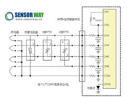 LTC2983可配置為通用溫度測(cè)量電路(參見圖3)?山o單個(gè)LTC2983加上多達(dá)4組通用輸入。每一組輸入都可以直接用來數(shù)字化3線RTD、4線RTD、熱敏電阻器或熱電偶,而無需更改任何內(nèi)置硬件。每個(gè)傳感器都可以使用同樣的4個(gè)ADC輸入及保護(hù)/濾波電路,并可用軟件配置。所有4組傳感器都可以共用一個(gè)檢測(cè)電阻器,同時(shí)用一個(gè)二極管測(cè)量冷接點(diǎn)補(bǔ)償。LTC2983的輸入結(jié)構(gòu)允許任何傳感器連接到任何通道上。在LTC2983的任一和所有21個(gè)模擬輸入上,可以加上RTD、檢測(cè)電阻器、熱敏電阻器、熱電偶、二極管和冷接點(diǎn)補(bǔ)償?shù)娜我饨M合。