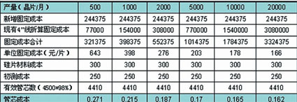 4”圓晶片生產(chǎn)線生產(chǎn)MEMS壓力傳感器Die成本估計如表所示,新增固定成本是指為該項目投入的人員成本和新設(shè)備的折舊(人員:專家1名+MEMS設(shè)計師2名+工程師4名+工藝師5名+技工12名,年成本147萬元,新增設(shè)備投入650萬元,按90%四年折舊計算);現(xiàn)有4”線成本是指在5次光刻條件下使用4”線的成本(包括人工、化劑、水電、備件等的均攤成本);硅片材料成本是指雙拋4寸硅片的價格。