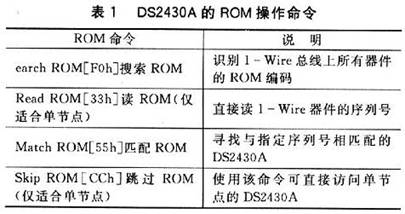 DS2430A的基本操作流程:初始化→ROM功能命令→存儲器功能命令→數(shù)據傳輸。與一般的1-Wire器件類似,所有數(shù)據處理均從初始化開始,數(shù)據傳輸都是從低位開始。初始化過程由單片機發(fā)送的復位脈沖和DS2430A發(fā)送的在線應答脈沖組成。應答脈沖用于通知單片機DS2430A已掛接在總線上,并已準備就緒。一旦單片機檢測到在線應答脈沖,就可以發(fā)出4條ROM功能命令中的1個。所有ROM功能命令的字長均是8位,表1是這些ROM命令的簡要介紹。