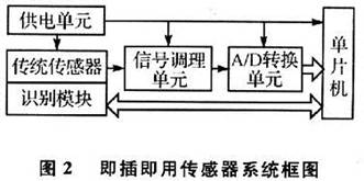 即插即用傳感器測量系統(tǒng)在硬件方面,主要由以下幾個部分組成:傳感器單元(包括傳統(tǒng)模擬傳感器和識別模塊)、供電單元、信號調理單元、A/D轉換單元,如圖2所示。
