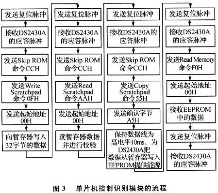 系統(tǒng)工作過程如下:單片機讀取識別模塊的信息,用以辨識當前與系統(tǒng)連接的傳感器,然后根據識別模塊的信息對調理電路進行適當配置;傳感器輸出的信號經過A/D轉換后送入單片機。若有必要,單片機可以通過適當?shù)姆绞綄?shù)據傳輸至上位機。如果要更換不同的傳感器,只需將單片機復位,系統(tǒng)即可再次根據當前傳感器單元的需要對電路進行配置,毋需人工干涉,從而實現(xiàn)了傳感器的即插即用。為實現(xiàn)這些目的,IEEE 1451.4標準定義了一種混合模式的接口,在保留了傳統(tǒng)傳感器模擬信號的同時,又附加了一個低成本的數(shù)字接口,用以傳送嵌入在傳感器中的傳感器電子數(shù)據表(TEDS),以實現(xiàn)自我身份識別和自我描述的功能。采用DS2430A構成的識別模塊主要存儲用于配置傳感器的TEDS信息。利用單片機AT89S51的P1.0腳向DS2430A數(shù)據存儲器單元00H和1FH寫入32字節(jié)TEDS數(shù)據,然后讀取數(shù)據存儲器的全部TEDS數(shù)據。單片機控制識別模塊的工作過程如圖3所示。
