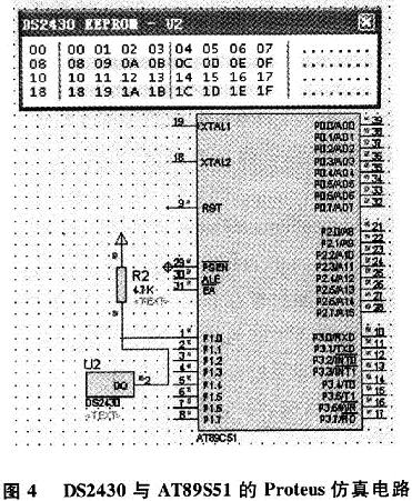 根據DS2430在即插即用傳感器系統(tǒng)中的應用要求,設計了DS2430與單片機AT89S51連接的Proteus仿真電路,如圖4所示。