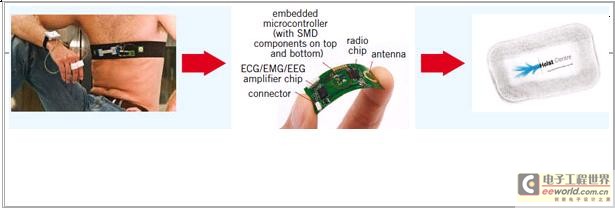 IMEC和霍爾斯特中心正在開發(fā)一款心電圖綁帶,該產(chǎn)品像運動員所用的傳統(tǒng)心臟監(jiān)測帶一樣使用。這款帶子不僅能監(jiān)測心跳,還可以記錄和傳送完整的心電圖。該設備可供有心臟病的戶外活動愛好者非常方便地使用,或在競技活動中使用(這款帶子已經(jīng)在布魯塞爾馬拉松里進行過測試)。目的難題在于要將系統(tǒng)小型化和實現(xiàn)足夠水平的自立性。根據(jù)應用的不同,可能是要能使用幾天或永久性使用。最終目標是要將這款電子心臟專家集成到一個小盒子中,而這個小盒子要能附著在一條帶子上(圖4),或者能嵌入到一件襯衫里則更好。