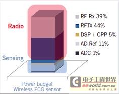功耗可通過檢查傳感器的單獨標準構(gòu)件來預算心電圖傳感器節(jié)點的功率:傳感和讀取單元、無線通訊、數(shù)字信號處理器(DSP)和供電單元。顯然,節(jié)點中最耗電的是射頻芯片,射頻芯片負責傳感器數(shù)據(jù)的無線傳輸(圖5)。通常,實現(xiàn)無線通訊功能所耗費的功率占總功率預算的50%至85%。
