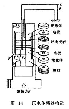 壓電式減振器主要由壓電傳感器、壓電執(zhí)行器和阻尼力變換閥三部分組成。壓電傳感器和壓電執(zhí)行器所用的壓電元件是一個壓電陶瓷元件,其主要成分是鉛、鋯和鐵。壓電元件都是利用壓電效應的原理進行工作的。如圖 13所示,當在壓電元件上施加外力時,壓電元件將產生電壓,這一現象稱為壓電正效應;而給壓電元件施加電壓,則壓電元件將產生位移,這一現象稱為壓電負效應。壓電傳感器6就是根據壓電正效應進行工作的。當由顛簸路面而引起的沖擊力作用在減振器支撐桿上時,由于壓電正效應的作用,在壓電傳感器上大約2μs的短時間內就可產生電壓信號。圖 14所示為壓電傳感器的構造。圖中壓電元件有5層,每層厚度為0.5mm。