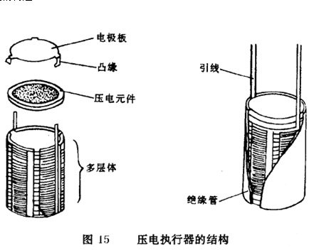電子控制單元接收到壓電傳感器的電壓信號后,立即對壓電執(zhí)行器施加電壓。圖 15所示為壓電執(zhí)行器的結構。由88個壓電元件所組成的壓電執(zhí)行器根據電子控制單元發(fā)出的指令被施加電壓后,由于壓電負效應的作用,在約5ms的時間內產生50μm左右的位移。此位移經活塞和推桿所放大后,使阻尼力變換閥動作。圖12(b)為壓電執(zhí)行器未動作時的“硬”工況。圖 12(c)為壓電執(zhí)行器動作后的“軟”工況。壓電式減振器從出現顛簸信號到阻尼力變換閥動作僅需幾毫秒的時間,因此這種減振器阻尼力電子控制系統(tǒng)具有很高的響應能力。