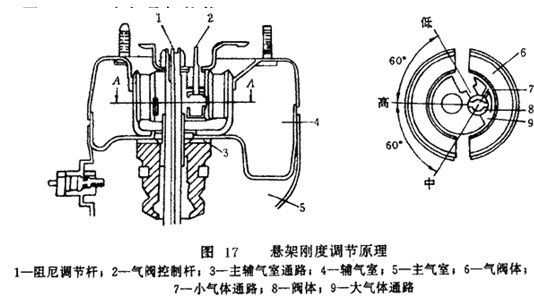 2.懸掛剛度調節(jié)原理懸掛剛度的調節(jié)原理如圖 17所示。主、輔氣室之間的氣閥體上有大小兩個通路。懸掛控制執(zhí)行器帶動氣閥體控制桿轉動,使閥芯轉過一個角度,改變通路的大小,就可以改變主、輔氣室之間的氣體流量,使懸掛剛度發(fā)生變化。