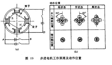 電磁線圈控制的電磁制動開關松開時,制動桿處于扇形齒輪的滑槽內,扇形齒輪可以轉動;電磁制動開關吸合時,制動桿往回拉,齒輪系處于鎖住狀態(tài),各轉閥均不能轉動,使懸掛的參數保持在相對穩(wěn)定的狀態(tài)下。步進電機的基本工作原理如圖 19所示。步進電機的轉子由永久磁鐵制成。定子有兩對磁極,其上繞有A-B、C-D兩相繞組,當A-B繞組接通正向電流時(電流從A端流入,B端流出),永磁轉子將在定子磁極磁場的作用下,處于圖 19(b)所示的“低狀態(tài)”位置。