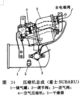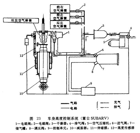 圖 23所示為日本富士汽車空氣懸掛的車身高度控制系統(tǒng)。由圖可以看出,系統(tǒng)主要由空氣壓縮機、排氣閥、干燥器、進氣閥、儲氣罐、調壓閥、電磁閥、高度傳感器、氣室及控制單元等組成。