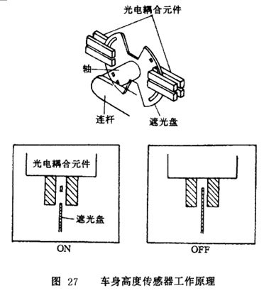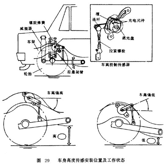 圖 29所示為車身高度傳感器的安裝位置及工作狀態(tài)。拉緊螺栓的上端與傳感器的連桿鉸連,下端與后懸掛臂相連。當車身上下振動時,拉緊螺栓帶動連桿使傳感器的軸左右旋轉,光電耦合元件則把旋轉信號轉換成車高信號輸出。
