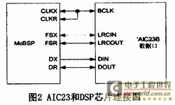 VC5509有兩個多通道緩沖串行口(McBSP),McBSP具有與標準串行接口相同的基本功能,并在標準串行接口的基礎之上對功能進行了擴展。本系統(tǒng)使用的語音采集芯片AIC23就通過McBSP和DSP相連接,其連接示意圖如圖2所示。其中CLKX為發(fā)送時鐘,CLKR為接收時鐘,它們都和AIC23的系統(tǒng)時鐘BCLK相連。FSX和FSR實現(xiàn)發(fā)送和接收的幀同步,對應AIC23的LRCIN和LRCOUT引腳。數(shù)據(jù)發(fā)送引腳DX和數(shù)據(jù)接收引腳DR分別與AIC23的DIN和DOUT相連,完成串行數(shù)據(jù)發(fā)送和接收操作。
