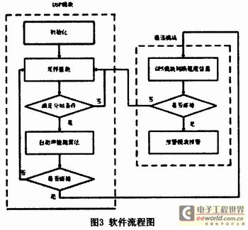 自動聲檢測算法讀出數(shù)據(jù)并進行判斷,如果檢測到的是非碰撞事件,則繼續(xù)執(zhí)行采樣檢測以等待處理下一秒數(shù)據(jù),這時軟件在執(zhí)行空循環(huán);當自動聲檢測算法檢測到的是碰撞事件,就向通訊模塊傳遞信息,在GPS模塊確認速度和位置信息之后就通過報警模塊報警。此軟件的流程如圖3所示。