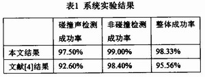 我們的碰撞聲檢測儀在一個模擬的環(huán)境下進行測試,盡可能地還原真實場景。使用低失真功放裝置反復對真實場景中采集到的碰撞信號進行實驗。并和文獻中的實驗結果進行了對比。其中整體成功率是對判斷對的樣本總數(shù)和實驗樣本總數(shù)的比值。實驗結果示于表1。