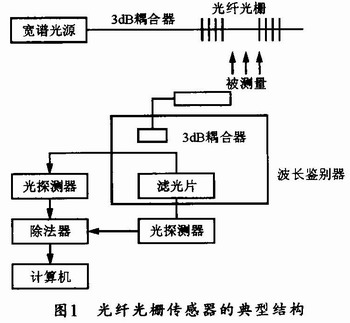 在圖1所示的光纖光柵傳感器結(jié)構(gòu)中,光源為寬譜光源且有足夠大的功率,以保證光柵反射信號(hào)良好的信噪比。一般選用側(cè)面發(fā)光二極管ELED的原因是其耦合進(jìn)單模光纖的光功率至少為50~100 μW。而當(dāng)被測溫度或壓力加在光纖光柵上時(shí)。由光纖光柵反射回的光信號(hào)可通過3 dB光纖定向耦合器送到波長鑒別器或波長分析器,然后通過光探測器進(jìn)行光電轉(zhuǎn)換,最后由計(jì)算機(jī)進(jìn)行分析、儲(chǔ)存,并按用戶規(guī)定的格式在計(jì)算機(jī)上顯示出被測量的大小。