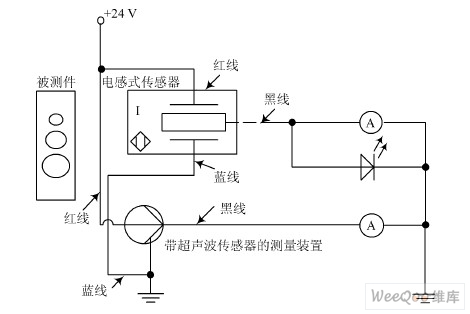 本文通過帶超聲波傳感器的信號(hào)調(diào)理電路與電流表顯示, 確定系統(tǒng)輸入信號(hào)與輸出信號(hào)之間的關(guān)系。由此得出模擬量輸出電感式傳感器的線性檢測(cè)區(qū)域。圖5為檢測(cè)接線圖( 紅色相連的為電源正極性等電位點(diǎn), 藍(lán)色相連的為電源負(fù)極性等電位點(diǎn))。