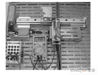 圖6 中以帶3 個(gè)安裝螺孔的鋁板( 80 mm @80 mm) 用作被測(cè)工件, 將鋁板安裝在非旋轉(zhuǎn)試件托架上, 并與支架導(dǎo)軌平行。高度補(bǔ)償器在距離導(dǎo)軌4 mm處, 與導(dǎo)軌平行安裝。電感器模擬量輸出傳感器安裝在高度補(bǔ)償器上。由于之前已確定模擬量式電感傳感器的線性測(cè)定范圍, 所以此時(shí)的電流表不在接于超聲波傳感器之上, 而接在電感式傳感器上。