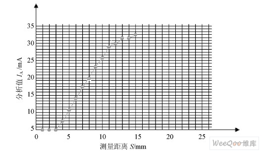 由圖7 可見, 對(duì)于該款電感式模擬量輸出傳感器,在3 mm 到10 mm 范圍之間, 電流從0 mA 變化到25 mA, 且距離與電流成線性關(guān)系; 超出此范圍之外, 距離與電流成非線性關(guān)系, 在此范圍( 3~ 10 mm) 內(nèi), 電感式模擬量輸出傳感器不會(huì)產(chǎn)生遲滯。因此, 電感式模擬量輸出傳感器適用于對(duì)指定材料的距離進(jìn)行測(cè)量。