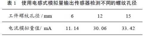 模擬量式電感傳感器能夠提供一個(gè)與物體位移成比例的電流或電壓信號(hào), 通過不同的測(cè)量電流或電壓測(cè)量值, 可以估算出圓孔直徑的大小。實(shí)際測(cè)量中, 側(cè)向精度與圓孔的直徑大小及材料有關(guān), 如果圓孔的直徑越小, 模擬量式電感傳感器輸出的衰減越大, 檢測(cè)螺紋孔徑的微小差距就相對(duì)比較精確。當(dāng)然, 對(duì)于圓孔材料,鋁材料的換算系數(shù)為0. 42, 而高級(jí)鋼換算系數(shù)為0. 72,鋁材料的換算系數(shù)相對(duì)較小, 因此使用高換算系數(shù)的材料會(huì)提高本款測(cè)試系統(tǒng)的靈敏度, 以便完成可靠的檢測(cè)和控制任務(wù)。