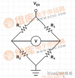 圖1:受激勵(lì)電壓VEX和差分輸出電壓V驅(qū)動(dòng)的惠斯頓橋。