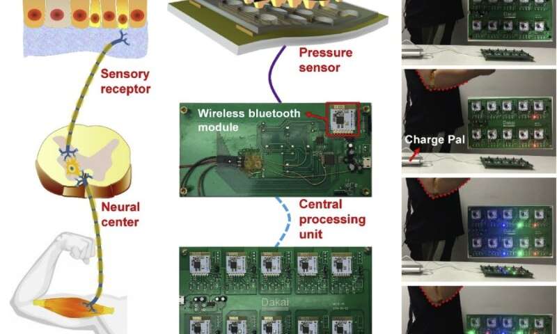 該團(tuán)隊(duì)還設(shè)計(jì)了一個(gè)人工體細(xì)胞反射弧,以模仿生物系統(tǒng)中的反應(yīng)。傳感器安裝在志愿者的肘部。隨著志愿者增加彎曲角度,信號(hào)通過(guò)無(wú)線藍(lán)牙模塊傳輸?shù)焦δ軉卧,功能單元中的LED點(diǎn)亮量也增加。