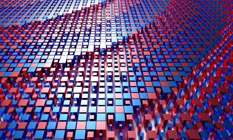 為緊湊的深度感應(yīng)設(shè)計(jì)的金屬元件的插圖。它由亞波長(zhǎng)間隔的方形納米柱組成。通過(guò)交替顯示兩種不同的納米柱圖案(在此以紅色和藍(lán)色顯示),該金屬元素同時(shí)形成了兩個(gè)圖像。這兩個(gè)圖像模仿了跳躍蜘蛛眼中分層視網(wǎng)膜捕獲的圖像。圖片來(lái)源:郭琦和石柱君/哈佛大學(xué)