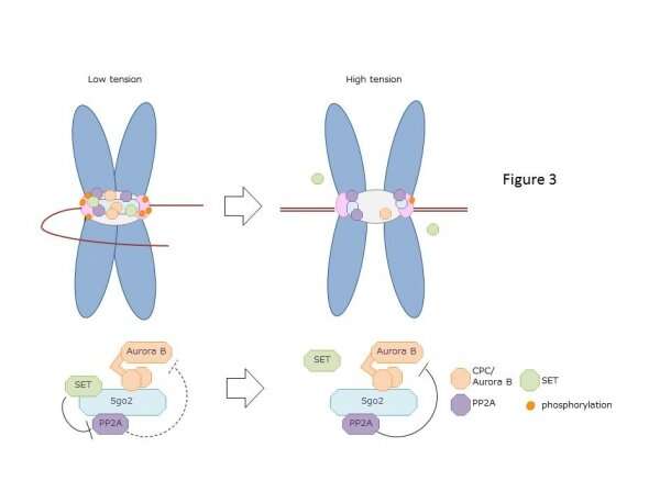 “自從1996年發(fā)現(xiàn)Aurora B激酶(Aurora B)以來,我們已經(jīng)發(fā)現(xiàn)Aurora B通過調(diào)節(jié)微管與動(dòng)粒體的附著來調(diào)節(jié)染色體,從而作為張力傳感器發(fā)揮了不可或缺的作用,并且蛋白磷酸酶2(PP2A)也起作用通過控制與Aurora B相關(guān)的染色體排列來作為張力傳感器!睎|京早稻田大學(xué)的Yasuhiko Terada教授說!暗牵撓到y(tǒng)極其復(fù)雜,其分子機(jī)理還沒有被很好地理解!