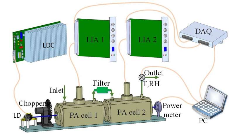 研究小組成員劉Kun教授解釋說:“該PAS(D-PAS)基于443 nm激光二極管! “通過優(yōu)化聲諧振器的結構,我們實現(xiàn)了在線測量氣溶膠吸收和NO 2的高靈敏度和大流量!