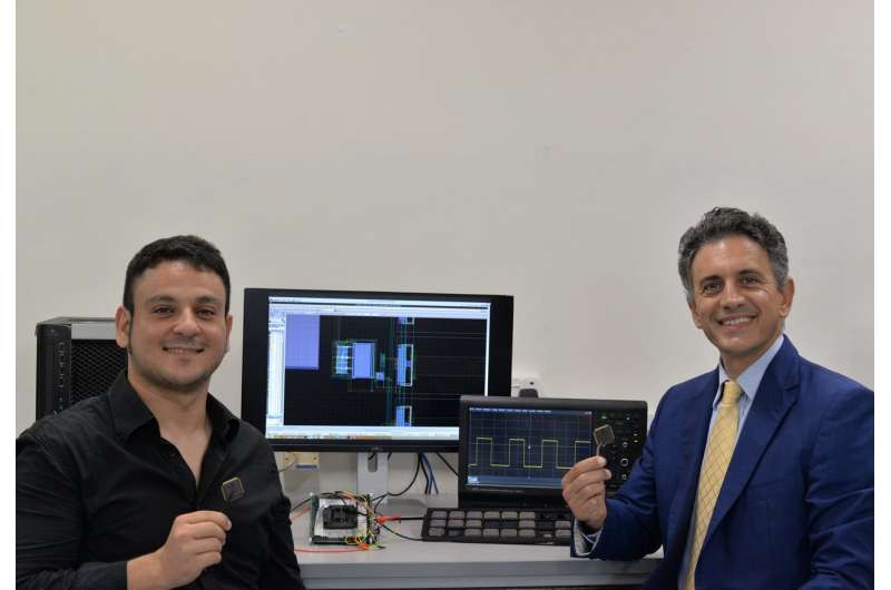 NUS研究人員發(fā)明了一種低成本的“無電池”喚醒定時器,可將IoT傳感器節(jié)點的功耗降低1000倍,從而有助于持久運行。喚醒定時器嵌入在測試芯片中,并放置在較大的封裝中(由兩個研究人員持有),以便于測試和表征。左起:新加坡國立大學工程學院的Orazio Aiello博士和Massimo Alioto副教授