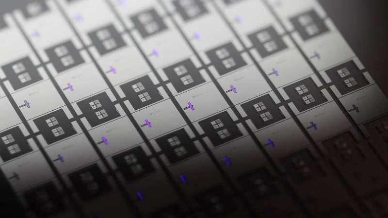 量子電路實(shí)驗(yàn)中使用的聲波器件的陣列。明亮的紫色部分是設(shè)備的活動(dòng)部分。圖片來(lái)源:凱文·薩辛格(Kevin J. Satzinger)