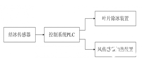 結(jié)冰傳感器安裝在機艙頂部,將結(jié)冰厚度信息轉(zhuǎn)換成電壓或電流信號,傳送給風(fēng)機主控系統(tǒng)PLC。PLC根據(jù)預(yù)先設(shè)定的冰層厚度閥值控制除冰裝置的起停。利用機組主控系統(tǒng)PLC預(yù)留的IO接口即可實現(xiàn)結(jié)冰厚度的采集和除冰裝置的控制,降低系統(tǒng)成本。