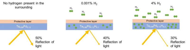 圖1.光學(xué)氫傳感器如何工作的示意圖。在氫附近,鉭(Ta)和鈀(Pd)基材料吸收氫(H)。該區(qū)域中的氫氣量越大,材料吸收的氫氣越多。隨著材料吸收氫,其光學(xué)性質(zhì)會發(fā)生變化。通過例如測量由材料反射的光的量,可以確定氫壓力或氫濃度。圖片來源:TU Delft
