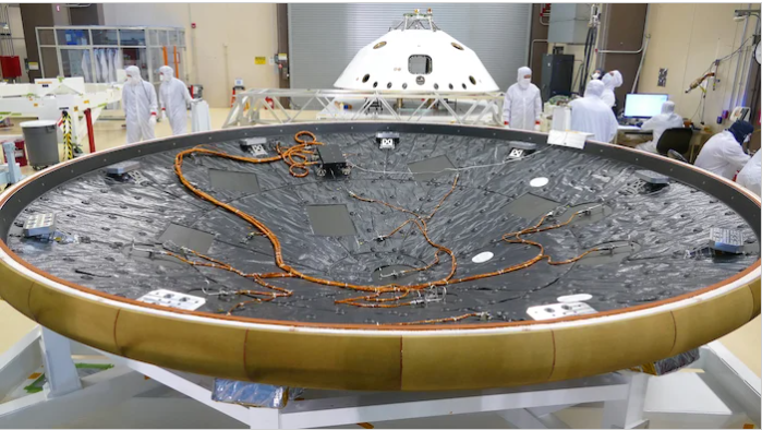 MEDLI2包括傳感器,電子設(shè)備和線束,它們安裝在Mars 2020隔熱板上。圖片由NASA / JPL-Caltech提供